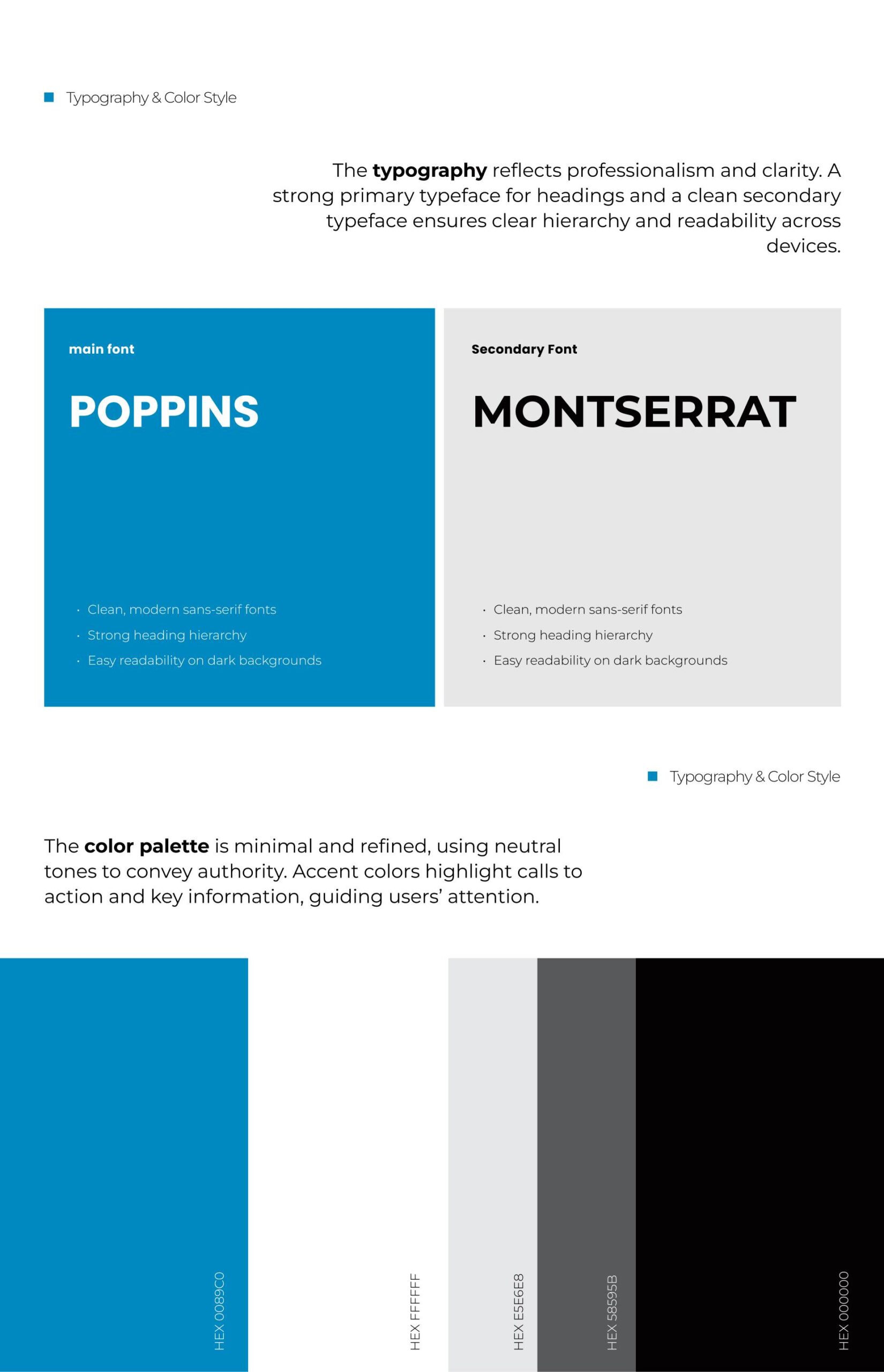 A restrained color palette, strong typography, and generous spacing work together to create a calm, trustworthy experience that supports user decision-making.