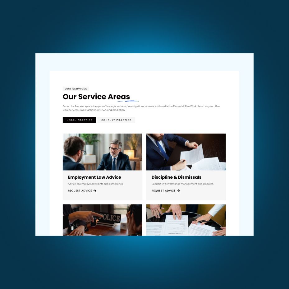 This project involved designing a modern, approachable website for a law firm that values clarity, professionalism, and client trust. The objective was to translate complex legal services into a structured, easy-to-navigate digital experience while maintaining a strong and credible brand presence. The final design supports both brand authority and client engagement across all devices.
